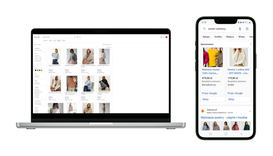 Reklamy zakupowe w Google to bardzo efektywne reklamy wyświetlające produkty bezpośrednio w wynikach wyszukiwania. Przedstawiają najważniejsze informacje o produkcie - zdjęcie, tytuł oraz cenę. W ten sposób jeszcze przed przejściem na stronę zwrócimy uwagę potencjalnego kupującego na Twoją ofertę.